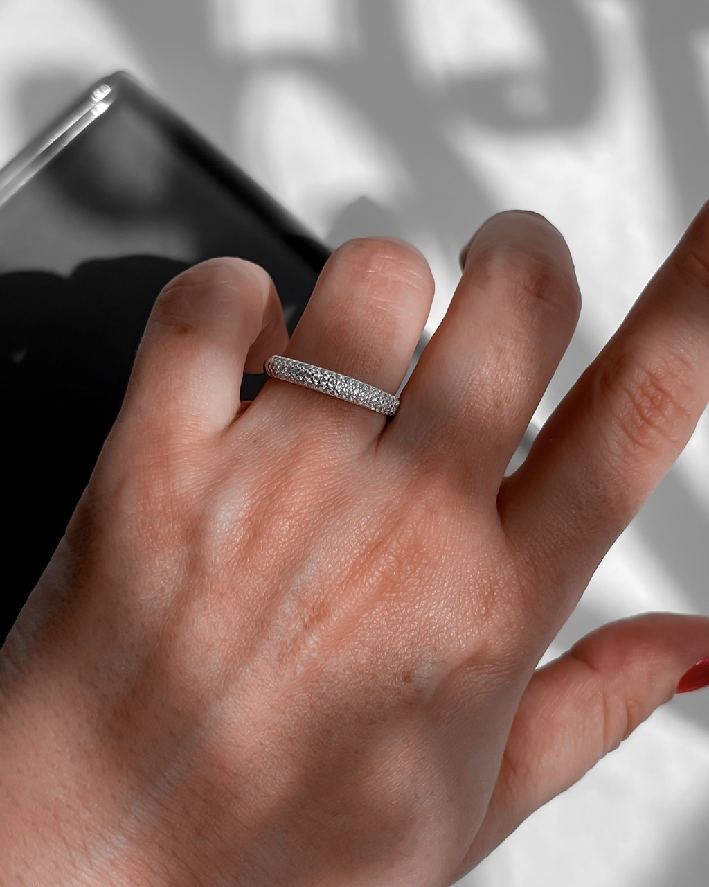 CARACTERÍSTICAS: Anel aparador meia aliança boleada, cravejada com zircônias na cor cristal, em prata 925.