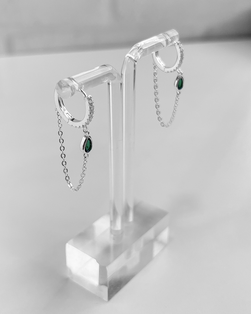 CARACTERÍSTICAS: Um par de argola de click, cravejada com zircônias na cor cristal, em prata 925. Possui uma corrente em elos com uma zircônia verde em formato de gota, fixa na correntinha.