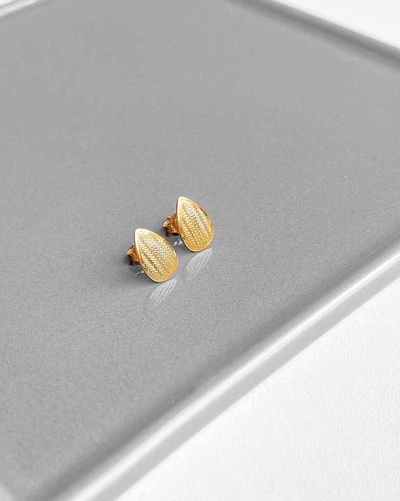 CARACTERÍSTICAS: Brinco Gota Amanda em banho de ouro 18k de 4 milésimos com detalhes estampados.