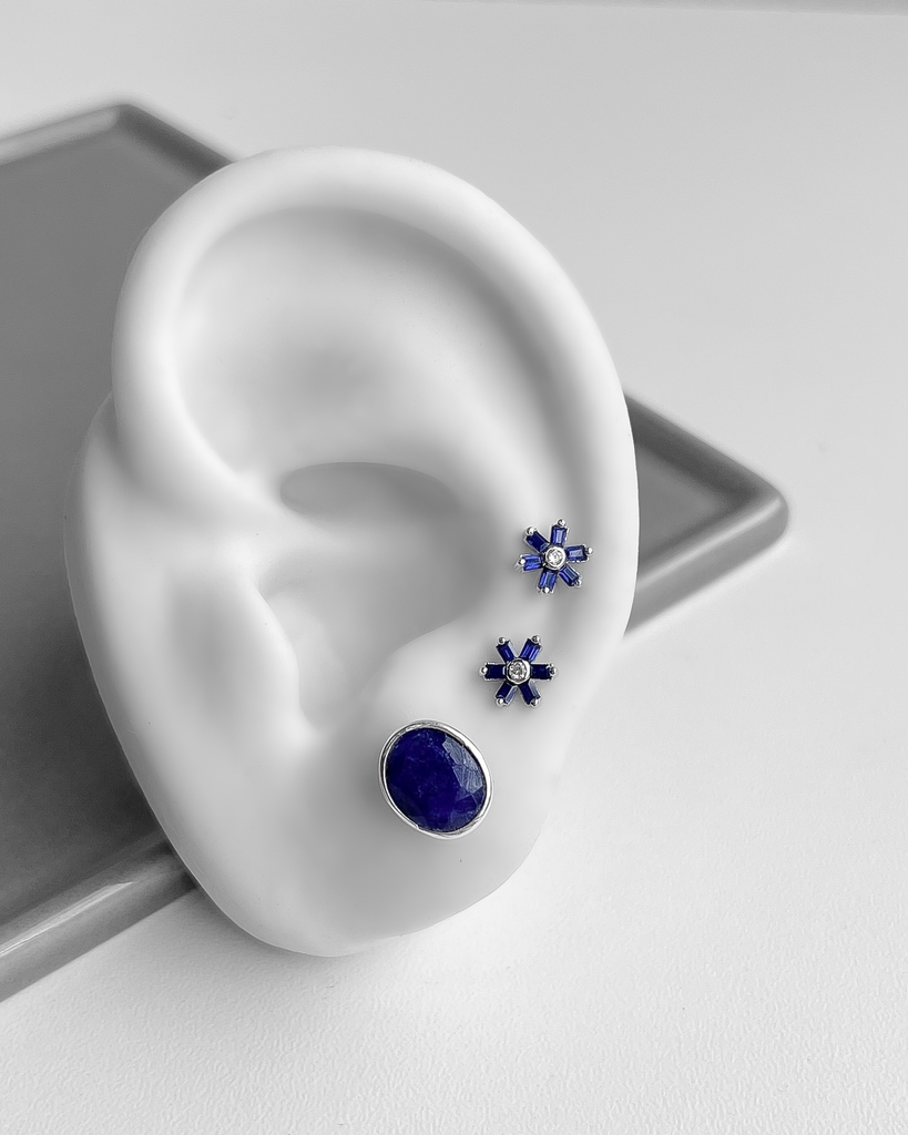 DESCRIÇÃO: Esse brinco tem o formato de uma pequena flor cravejada com zircônias azuis e uma zircônia central cristal. Ele é um acessório muito delicado e ideal para fazer composições com outros brincos. Por ser pequeno também pode ser usado por crianças.