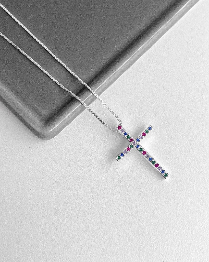 CARACTERÍSTICAS: Colar em veneziana com crucifixo cravejado com zircônias coloridas, em prata 925.