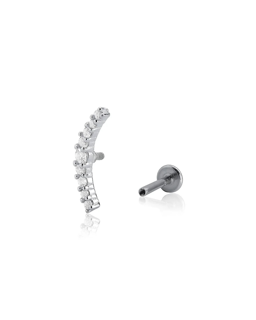 CARACTERÍSTICAS: Uma unidade de piercing linha curva cravejada com zircônias na cor cristal, em prata 925. Sua haste (microbel) é em aço cirúrgico. Adaptável a vários furos na orelha como: hélix, conch, flat ou até mesmo nos furos do lóbulo como segundo e terceiro furo. Sua forma de fecho é de rosca interna, onde a parte da frente é rosqueada na haste. A base da haste tem formato redondo com sua superfície reta.