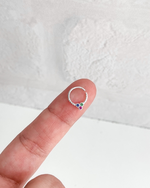 CARACTERÍSTICAS: Uma unidade de piercing argola em prata 925, com três pontos de luz cravjeados com zircônias embutidas nas cores: rosa, azul bic e verde. Indicado para ser usado no Hélix da orelha ou sépto no nariz. Forma de abertura: torção.