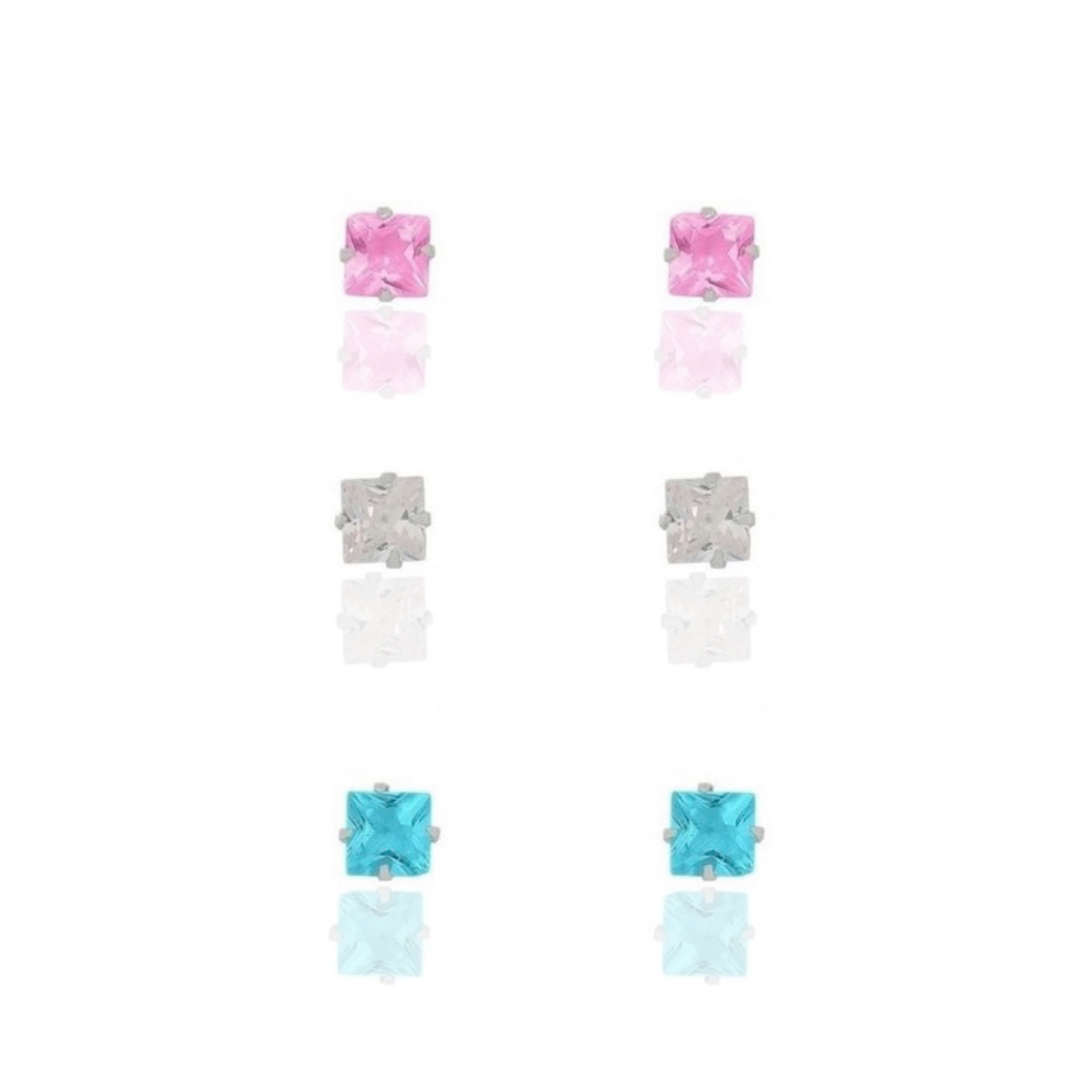 CARACTERÍSTICAS: Trio de brincos ponto de luz em prata 925 com pedra quadrada de zircônia na cor azul, rosa e branca. Tarraxa borboleta.